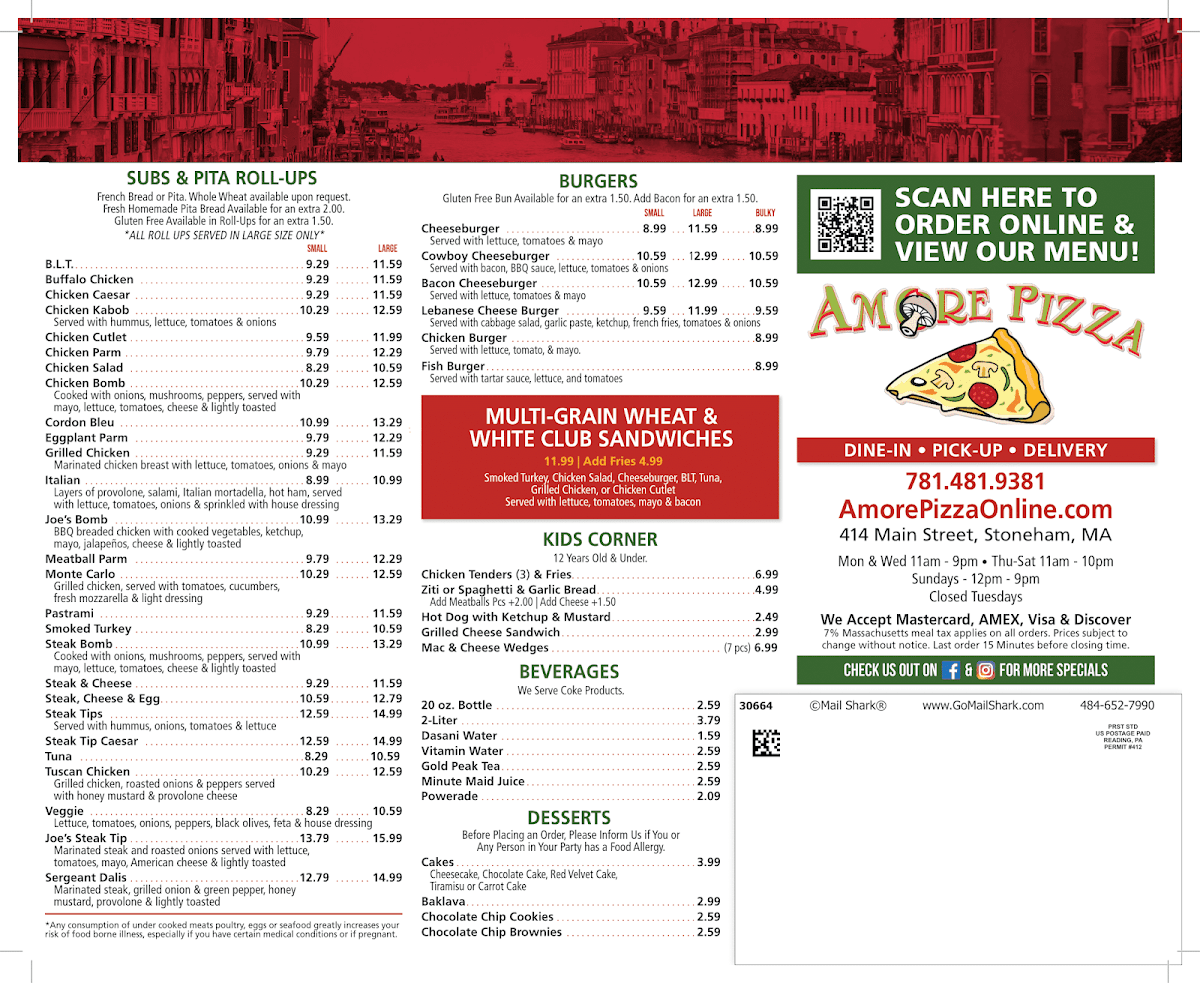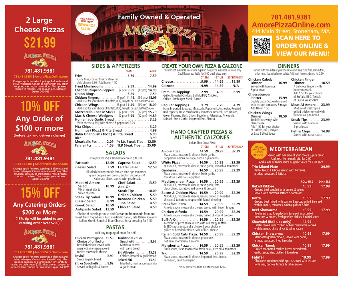 Whether you’re dining in or ordering out, Amore Pizza Stoneham promises swift service and quality food that will keep you coming back for more.